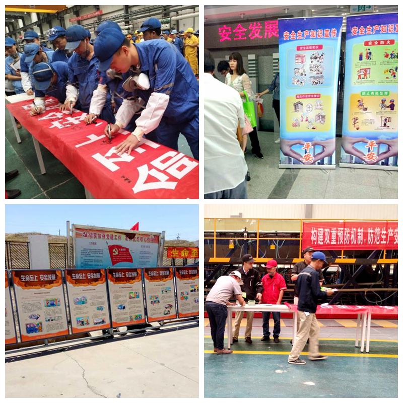 各分子公司在廠區(qū)各通道、大門口、辦公區(qū)門口懸掛安全生產宣傳彩旗,在醒目位置擺放安全宣傳欄,張貼安全生產宣傳橫幅,營造安全生產的濃厚氛圍;組織廣大員工逐一在主題橫幅上簽字,將“生命至上、安全發(fā)展”記在心中,用實際行動來詮釋安全生產。