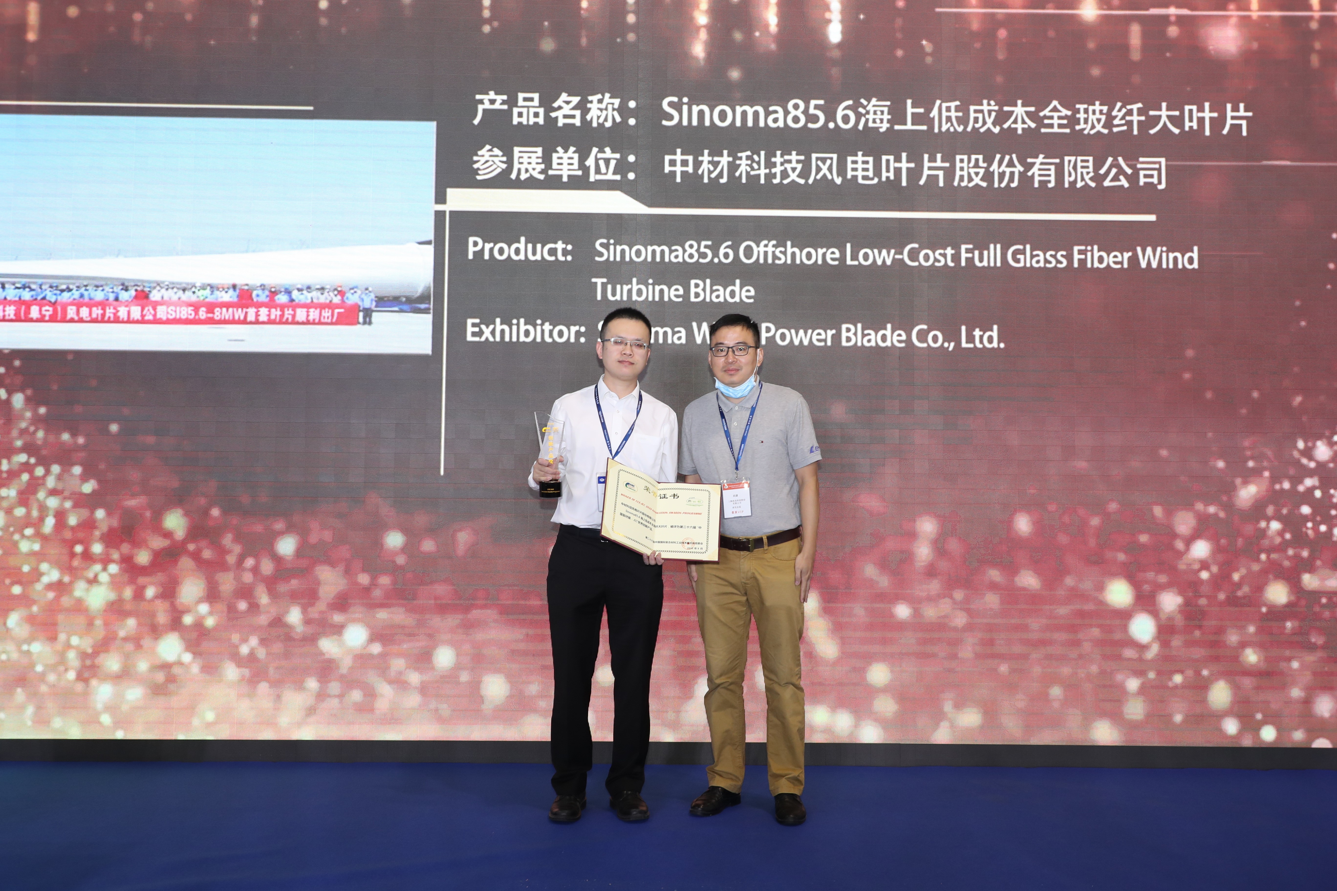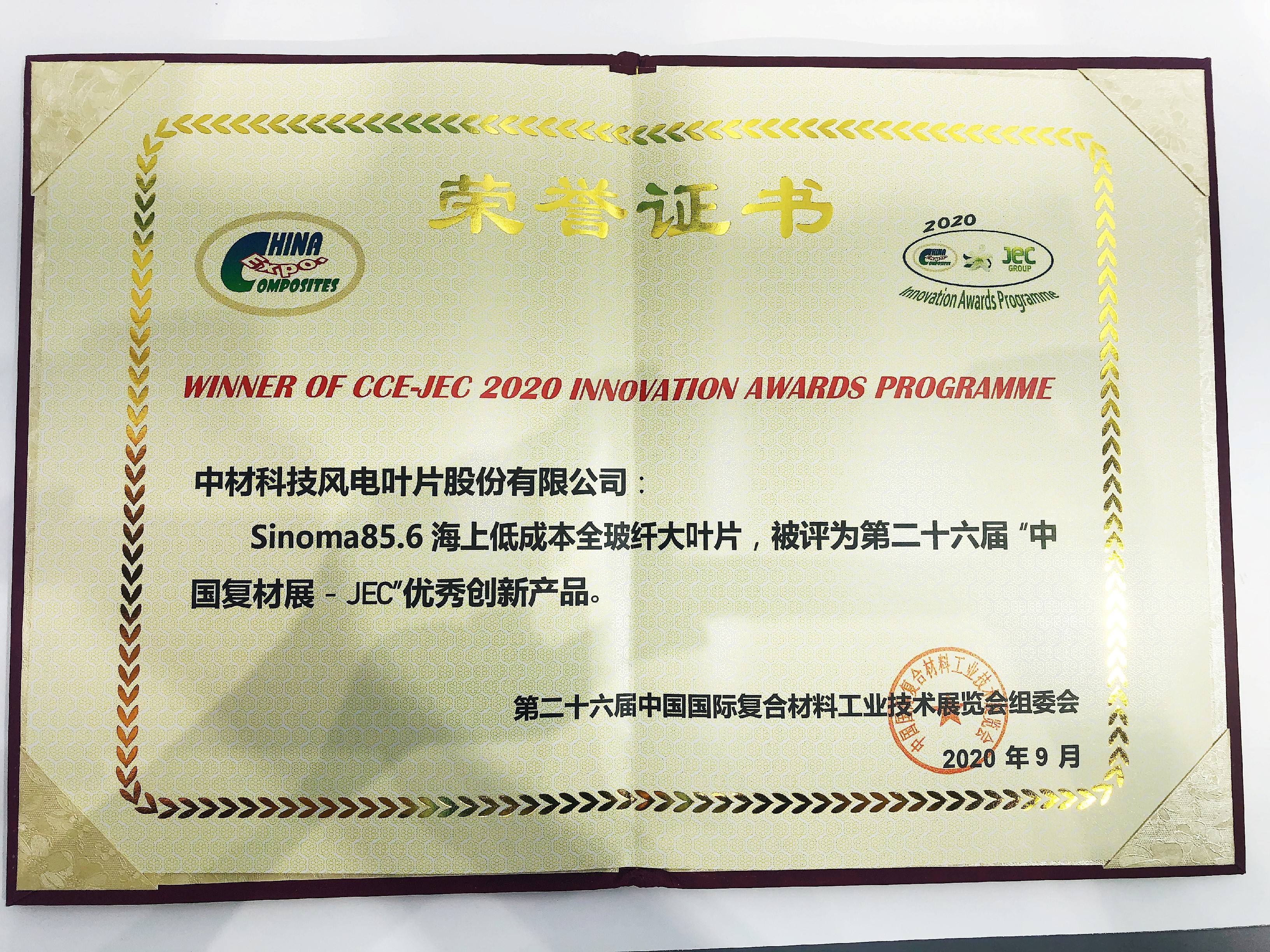 9月2日上午11點,在世博館2號館的新聞發布區舉行了隆重的2020 CCE-JEC創新產品頒獎儀式,來自國內外34家企業的44件創新產品角逐原材料、應用、工藝技術及設備三大類9項大獎。中材科技風電葉片股份有限公司的參展產品“Sinoma85.6海上低成本全玻纖大葉片”被評為第二十六屆“中國復材展-JEC”優秀創新產品獎。公司董事長薛忠民參加了頒獎儀式。