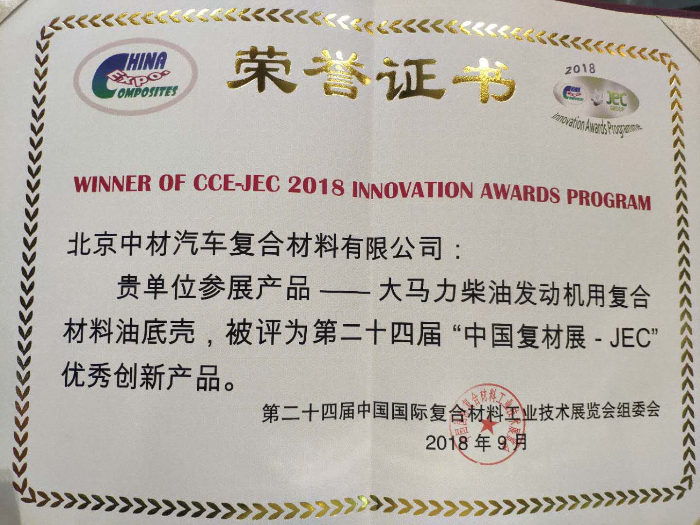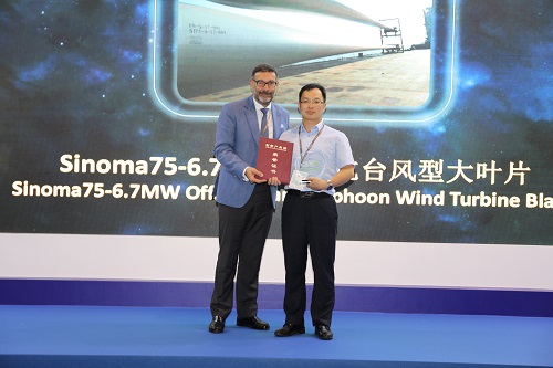 9月5日上午11點(diǎn),在2號(hào)展館新聞發(fā)布區(qū)進(jìn)行2018CCE-JEC創(chuàng)新產(chǎn)品頒獎(jiǎng)儀式,來(lái)自國(guó)內(nèi)外33家企業(yè)的42件創(chuàng)新產(chǎn)品角逐原材料、應(yīng)用、工藝與技術(shù)三大類十余項(xiàng)大獎(jiǎng)。中材科技風(fēng)電葉片股份有限公司的參展產(chǎn)品“75-6.7MW海上抗臺(tái)風(fēng)型大葉片”、北京中材汽車復(fù)合材料有限公司參展產(chǎn)品“大馬力柴油發(fā)動(dòng)機(jī)復(fù)合材料油底殼”兩項(xiàng)產(chǎn)品評(píng)為第二十四屆“中國(guó)復(fù)材展-JEC”優(yōu)秀創(chuàng)新產(chǎn)品獎(jiǎng)。公司董事長(zhǎng)薛忠民參加頒獎(jiǎng)儀式。